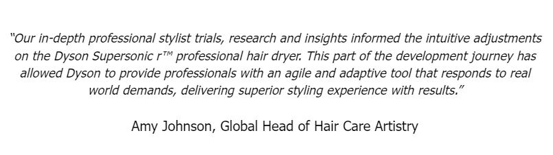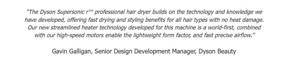 The Dyson Supersonic r™ professional hair dryer’s form factor is unique. Ergonomically designed in a revolutionary ‘r’ curve, it weighs just 325 grams3, less than the weight of a bottle of hairspray4, the shape allows professionals to effortlessly reach where it is normally hard to reach for control and comfort.