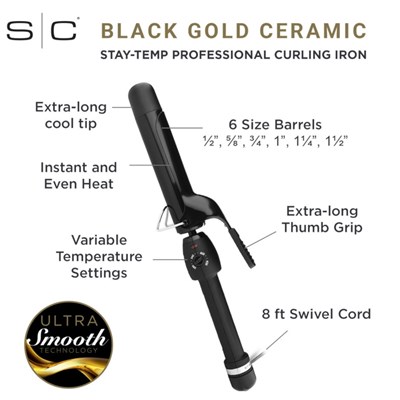 BLACK GOLD CERAMIC BARREL: Emits negative ions that seal the hair cuticles, reducing frizz and adding shine for a smoother, silkier curl
