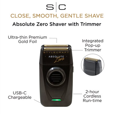 The StyleCraft Absolute Zero foil shaver provides one of the closest, smoothest, and gentlest shaving experiences. Tough on hair. Gentle on skin. Designed and engineered with ultra-thin, gold titanium foils and staggered, independently floating cutters. It’s an advanced design to give a closer, smoother shave, keeping the most sensitive skin free of razor bumps, ingrown hairs or skin irritation. A Lithium-ion battery delivers twice the standard run-time, with 120-minutes of cordless operation per charge with rapid recharging in just 30-minutes for both corded or cordless operation. An integrated retractable precision trimmer and a convenient multi-function universal mini-USB charger make the Absolute Zero the ultimate all in one tool ideal for worldwide travel.